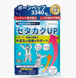 セタカクUPのサプリメントには、お子さまの成長期に欠かせないカルシウム・マグネシウムを配合。さらに、骨の成長をサポートするボーンペップも配合されています。